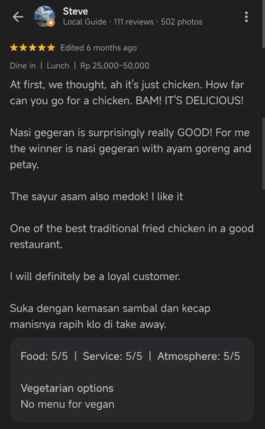 Ayam pejantan ungkep rempah dan bumbu kuning, selalu dimasak baru setiap hari.